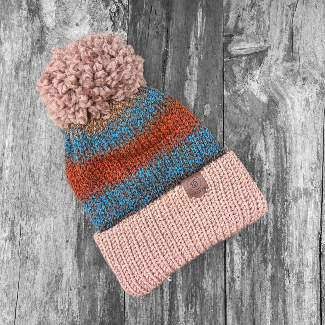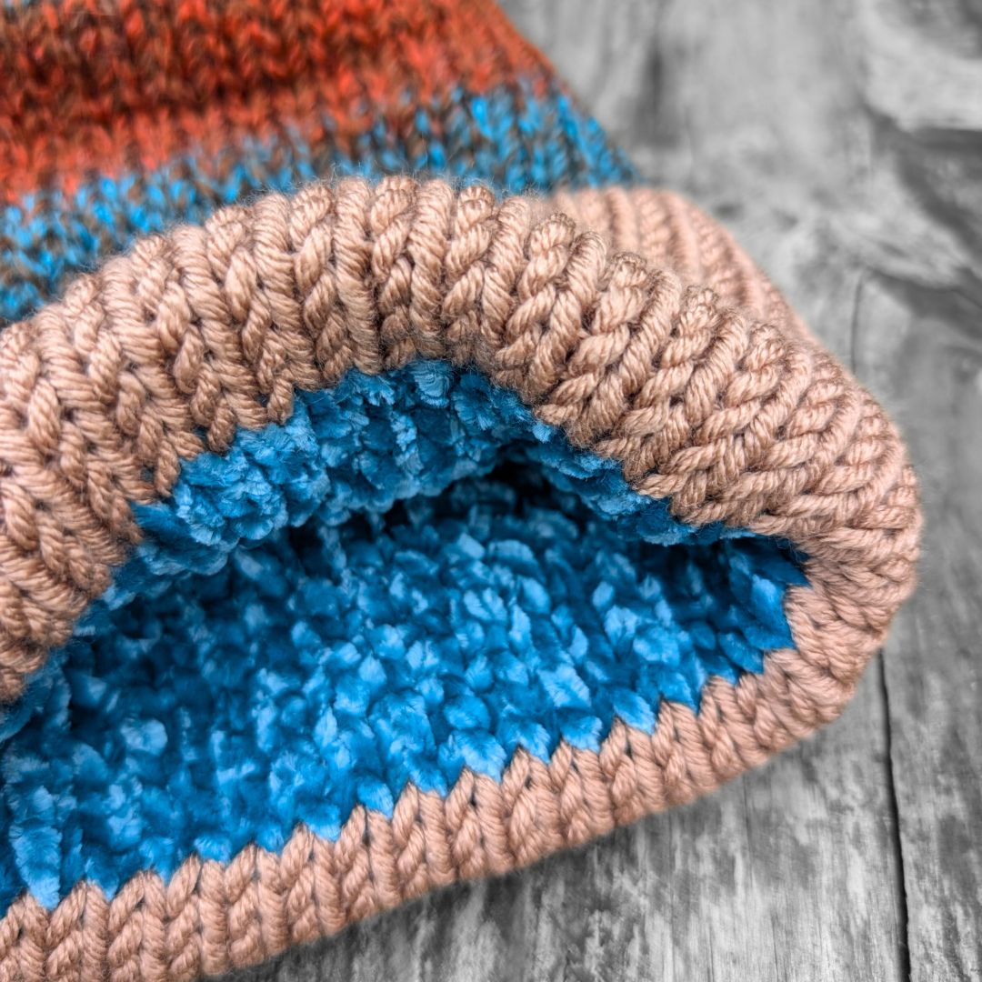 Velvet lined extra cosy beanie in tones of caramel, brown and teals with an teal velvet lining and a contrasting caramel pom.
